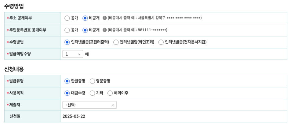 4. 보통 주소와 주민등록번호는 비공개 처리하고 인터넷 발급을 통해 PDF로 수령하시는 경우가 대부분이죠.